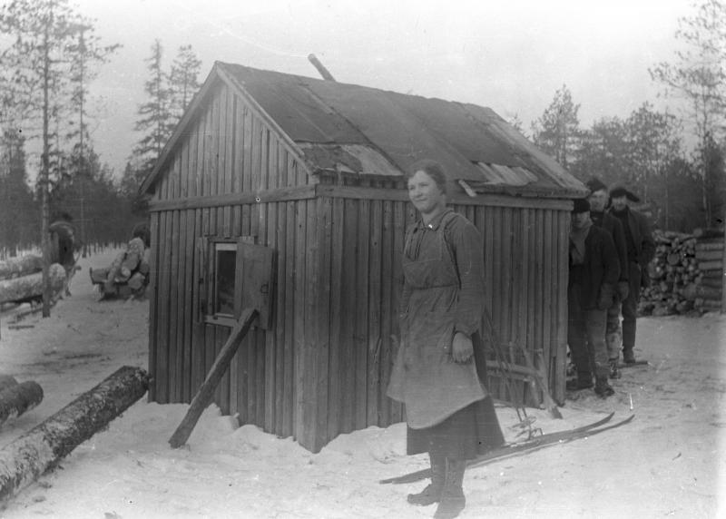 "V. 1920 Kerttu Leppälän ""kahvila"" Nousunlahdenperässä Soidinnevan laidassa Inhan tehtaalle vievän tien varressa. Päivittäin ajoi ohi kolmisensataa hevosta. Kerttu möi kahvia, leipomaansa pullaa ja tupakkaa." Valokuvaaja Verner Vanhamäki