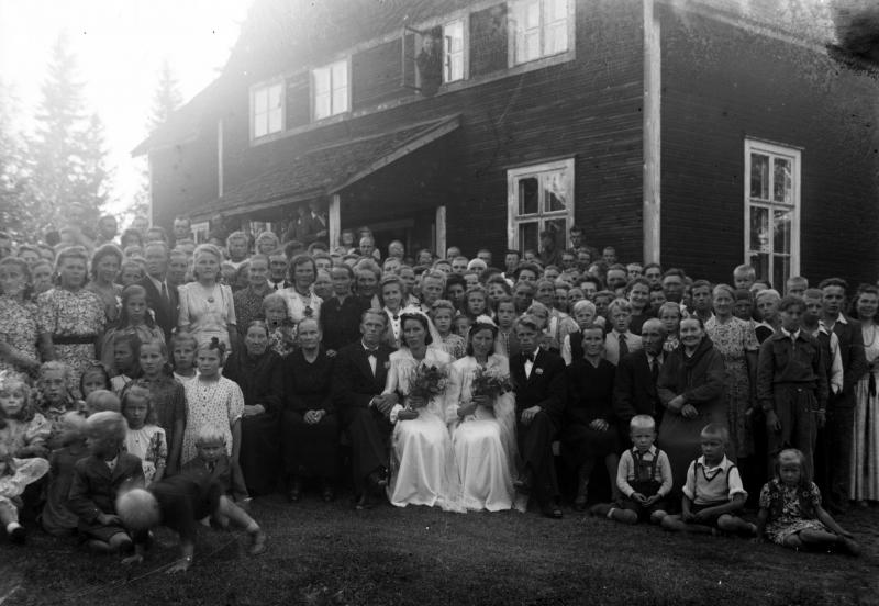 Viljo, Irma, Mirjam, Tenho Orpanan kaksoishäät Hakojärven raittiusyhdistyksen talolla 10.8.1946 Valokuvaaja Verner Vanhamäki