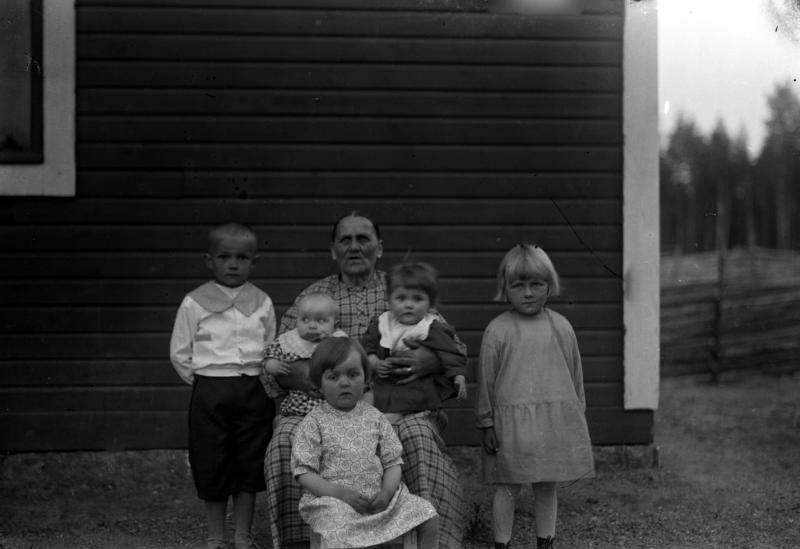 Kaisa Rantala (os. Juppo), oik. Aino Mäki-Tuuri (os. Rantala), vas. Armas Rantala, sylissä Saima Raearo (os. Rantala), sylissä Aili Mursula (os. Rantala), edessä Rauha Holkko (os. Rantala) Valokuvaaja Heikki Heikkola Kuvakoko 83x120