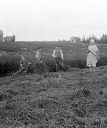 Lamminahon pellolla, Juho, Mirjam Lamminaho, Lähteenmaa Toivo?, Toivo, Heidi, Eino Lamminaho, Taustalla Vanhamäen talo. Hakojärvi