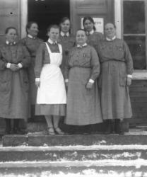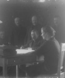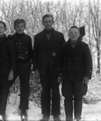 "Vihtori Erkkilä, Aarno Rankila, Väinö Katajapuu, Jussi Suutala, tak. Elli Hakola, essu edessä Anni Herrala (kaulakoru),