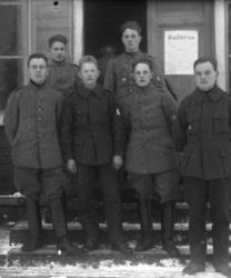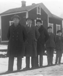 Jokelan veljekset edestä alkaen, Arvo, Artturi, Tauno, Alpo ja Paavo. Takana heidän kotinsa Töysän aseman vahtitupa, joka sijaitsi n. 4 km Töysän asemalta Ähtäriin päin.