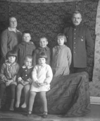 Urpo Kekoni linjatarkastaja. Takana Urpo ja Tyyni Kekoni, kesk vas. Kari, Pentti ja Aili, edessä vas. Kerttu, Matti ja Anna-Liisa. Perhe asui Töysän asemalla.