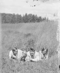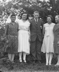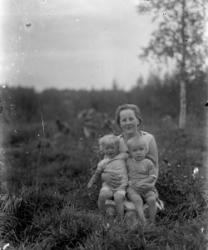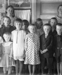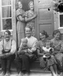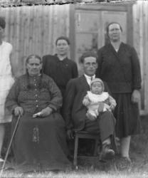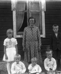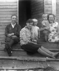 Vas. Takana Impi Salo myöh. Tanila, Hilja Salo, Tyyne Salo myöh. Kontoniemi, edessä vas. Kaisa Salo, Eino Kontoniemi, sylissä Viljami Kontoniemi
