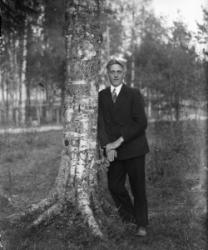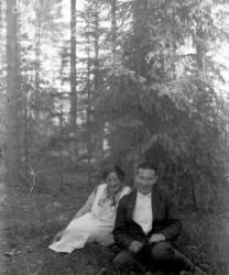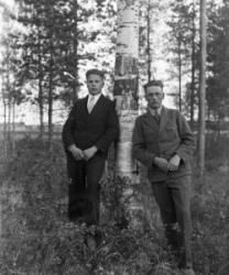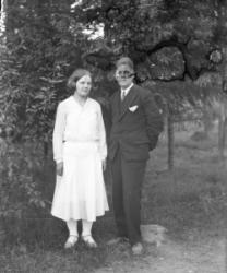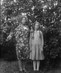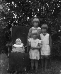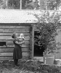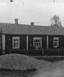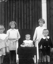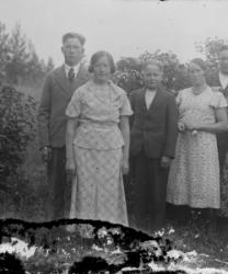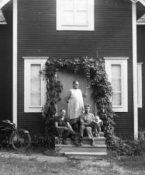 Edessä vas. Konsta (vanh) ja Selma Tyrni, heidän tak. Toini Tyrni - Koskenaho, Eemeli, Jalli nojaa ovea. Takana oik. Konsta Tyrni (nuorempi) + kolme serkkua Hämeestä.