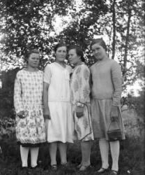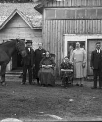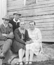 Eino ja Tyyne Kontoniemi talonsa edustalla oikealla. Vasemmalla Eemeli ja Sanna Paloranta, istumassa Kaisa ja Hilja Salo.