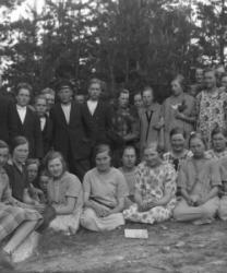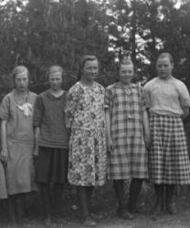 Istumassa vas. Hilda Mäkiranta, kolmas vas. Senja Mäkiranta, kuudes vas. Esteri Lamminaho.Oik. istumassa ? Järvinen, kolmas oik. ? Kortesmäki. 1908 syntyneet rippikoululaiset.