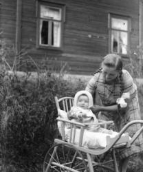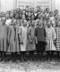 Khra Tuomola, kanttori Mattila, 2 rivi kesk. tumma Sonja Auraniemi, 2. tyttö oik. Alli Hakomäki, 1910 ja -11 syntyneitä. Töysän srk:n rippikoulu v. 1926.