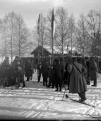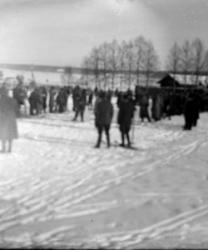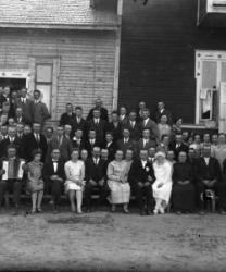 Haitarinsoittaja oik. Impi Pakkala, Matti Välkky, Ruusa Haveri, Valentin ja Hilma Myllymäki, morsiuspari Reino ja Heidi Kosola, Hilda ja Nestori Kosola, Ruusa, Jenny, Arvo ja Hilma Uusimäki, Väinö Ala-Mutka, Vieno Hepojoki, Toimi Kosola, Reino Kosola ja Heidi Välkky 25.5.1029