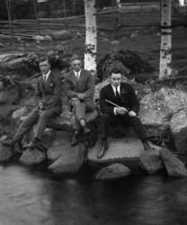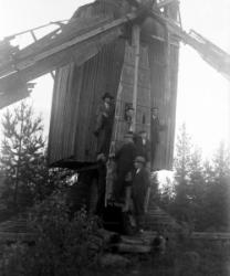 Kortesmäen tuulimylly Hakojärvellä, purettu. Miehet: Onni Lamminaho, Vihtori Katajamäki, Verner Vanhamäki, Juho Järvinen, Toivo Lamminaho ja Juho Lamminaho