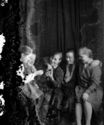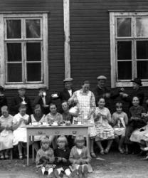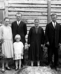 Vasemmalta Aino Maria (os. Katajamäki) ja Matti Einari Saarinen, heidän vanhin lapsensa Mirjam Kaarina (myöh. Etelä-aho), Mimmi (os. Saarikoski) ja Oskari Saarinen. Kuva otettu Oskari ja Mimmi Saarisen talon takana Tuurissa.