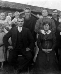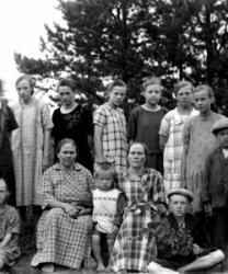Edessä Väinö Nikolai ja Hilma Maria Yhtiö. Oikealla Lyydi Heikintytär Peurala os. Yhtiö/Jokela sylissään Kaino-tytär ja hänen takanaan puoliso Heikki Vihtori Peurala sylissään poika Reino. Keskellä takana Heikki Niklas Erkinpoika Yhtiö/Jokela ja hänen toinen puolisonsa Loviisa Hermannintytär Kuivakangas. Vasemmalla oleva pariskunta Kaisa ja Heikki Lehtomäki. Vasemmalla takana Herman Oskar Yhtiö lapsi sylissään.