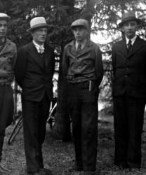 Edessä vas. istuvat Aleksi ja Liisa (os. Tanelintytär Ylimäki) Saarimäki, vas. nojaa kiveen Vihtori Katajamäki, vas. seisoo kiven etupuolelle Juho Lamminaho, hänen oikealla puolella ylempänä Onni Mäkiranta, hänen vieressään Fanni Kuivasmäki (myöh. Alava), Mäkirannan tytär, kolmas oikealta Hilma Ekola, vas. ylhäältä Kallioniemi, Aarno Ylimäki, Juho Järvinen, Matti ja Helmi (os. Vuorisalmi) Saarimäki.