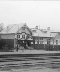 Tuurin asema koristeltuna v. 1933 Tampere-Vaasan radan 50-vuotisjuhlien kunniaksi. (1883-1933) Aseman henkilökunta kuvassa. Tuuri.
