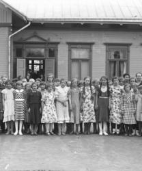 Töysän Kirkonkylän Koulun luokka 6 oppilaat ja opettajat keväällä 1935, opettajat Hakala ja Aino Åkerman. Oppilaat: Jorma Peltoniemi, Hilda Iso-aho, Inge? Lampila, Mirja Pirkkala?, Elli Mäenniemi, Aisi Mäkelä, Paula Ojala, Mirja Raiski, Saima Riihimäki, Irja Onnela, Laura Suomela, Eila Ojala, Anna Ylämäki, Meeri Saarikoski, Kerttu Penttilä, Viivi Peltomäki, Kerttu Virtanen, Anna-Liisa Mäkelä, Saima Heimola?, Lempi Hakomäki, Vaita Louhela, Martta Myllykoski, Aarne Ylimäki, Bertta Peltoniemi, Mauno Paavola, Unto Penttilä, Olavi Pohjala.