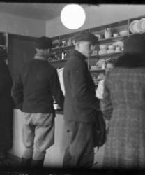 "Kuvassa neljä asiakasta, joita palvelemassa on kolme myyjää. Hyllyillä on kankaita ja astioita.