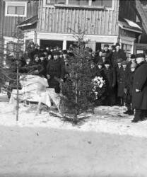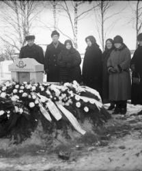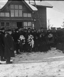 Pastori Frans Kärki, kanttori Mattila, suntio Juho Annala, edustalla mm: Elli Paavola, Jussi Toivola, Saima Aho, Aili Paavola, Ida Paavola, Arvo Aho, Fanny Paavola, istumassa Liisa Paavola, Yrjö Paavolan hautajaiset.