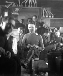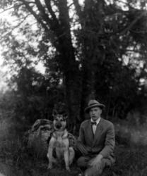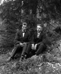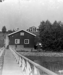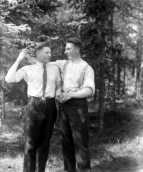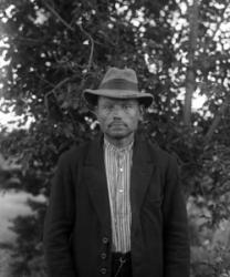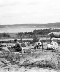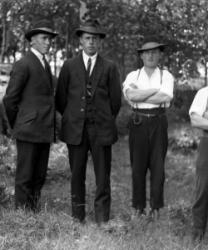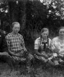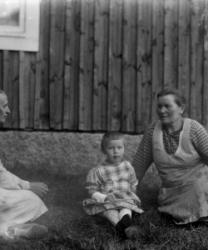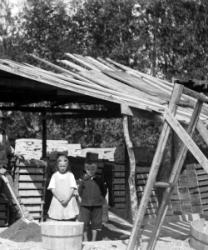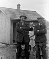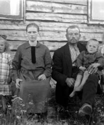 Matti Heikkola, Einari Vilppula, takana Impi Vilppula (os. Lehtomäki), lapset?. Impin saunan edessä.