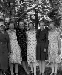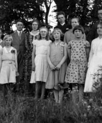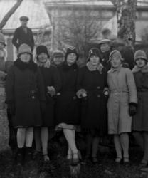 vas. opettaja Juho Hakala, Osmo Kanerva, Sulo Einola, takana oik. opettaja Aino Åkerman, Laina Pakkala, vas. lettipäinen tyttö Hilda Lähteenmaa, myöh. Moisio