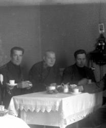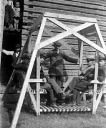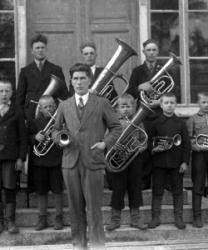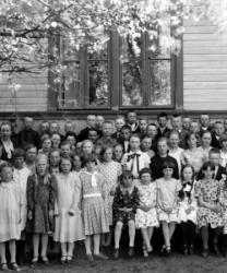 Töysän kirkonkylän kansakoulun oppilaita koulun päädyssä. Oikealla kirkkoherra Väinö Tuomola ja hänen takanaan pitkäaikainen koulun opettaja Juho Hakala (oli opettajana 1926-1946). Vasemmalla Aino Åkerman, toista naisopettajaa ei ole tunnistettu