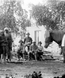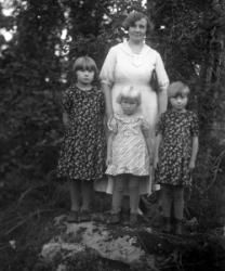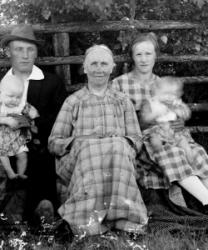 Takana vas. Reino Lehtomäki, Vihtori Luoma, Fanni Luoma os. Lehtomäki, Aino Ojansivu os. Luoma, kaksoset Raili ja Veikko, Vilhelmiina Luoma os. Pennala-Paavola, vas. edessä tunnistamatta