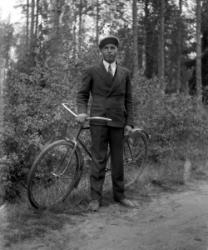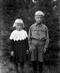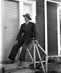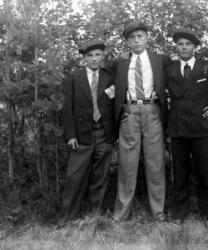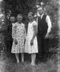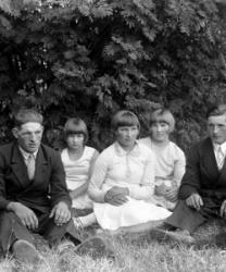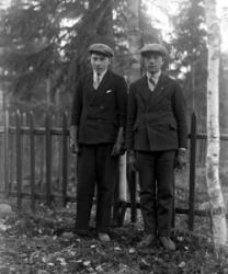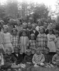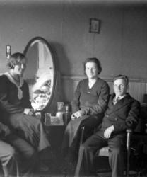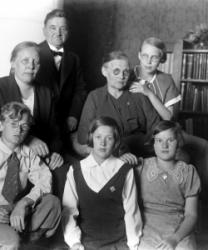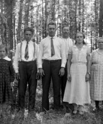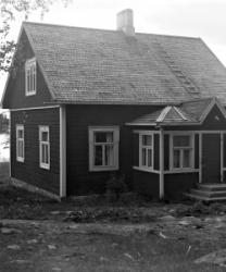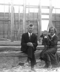 Juho ja Hilda (os. Mäkelä) Lahti, lapsi Kalevi tulevan kodin edustalla. Talo sijaitsee noin 3 km Töysän kirkolta Tuuriin päin menevän tien varrella, noin 100 m ennen Housunkylän tien risteystä.