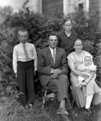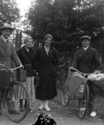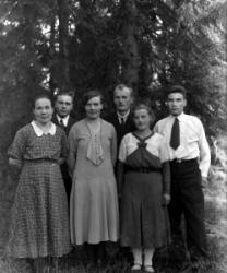 Vas. Lyyli Huutoniemi (nyk. Saarimäki), takana kesk. Vilho Huutoniemi, edessä oik. Hilma Ollikainen Miehet vas. Armas Haveri, Toivo Haveri, Niilo Koskituuri