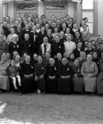 Äitienpäiväjuhlat kirkonkylän koululla 1929-1930-luvulla? Peltoniemi Hilda, Katajamäki Hilda, Lahti Hilda, Myllykoski Hilma, Housu Hilma, Mantila Lempi, Myllykangas Martta, Josefiina Lahola, Signe Lahola, eturivi 4. oik. Liisa Herrala, 3. oik. Sanna-Liisa Virtanen, 1. oik. Myllymäki, toinenrivi 1. oik. Toivola, Elli Paavola