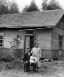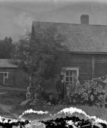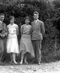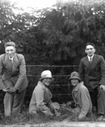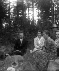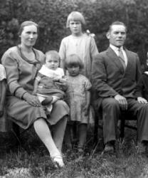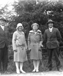 Heikki, Kerttu ja Fiinu Kuivasmäki, Lyydia ja Väinö Kontoniemi. Talo Suomelan takana, ompelija Hilja Kuivasmäen omistama.