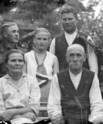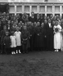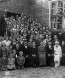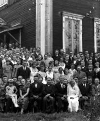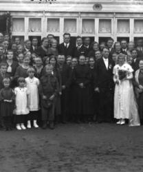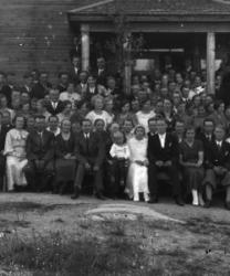 Vieno Erkkilän ja Ilmari Koivukankaan häät juhannusaattona 23.6.1934 Hakojärven nuorisoseuralla. Klarinetin soittaja Matti Hakojärvi (Saaren Matti). Vas. Eino ja Elsa Lamminaho, Aune ja Konstu Tyrni, takana Onni ja Toivo Lamminaho, sulhasen takana Matti ja Helmi Saarimäki, Juha ja Heidi Lamminaho.