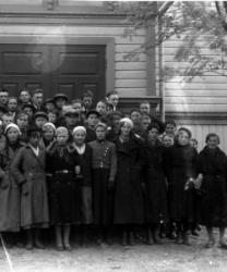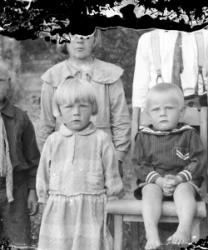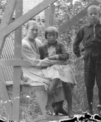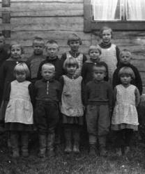 Kiertokoulukuva. Opettaja Saima Aho. Edessä vas. Eeva-Liisa Holkko, Jussi Holkko, Mirja Uusitalo, Armas Holkko, Saara Hankaniemi. Takana Väinö Keisala, Maija Holkko, Urho Holkko, Leevi Kankaanpää, Saima Uusitalo (myöh. Vannesluoma), Anna-Liisa Holkko (kaksi tuntematonta?).