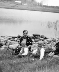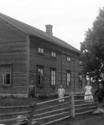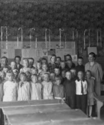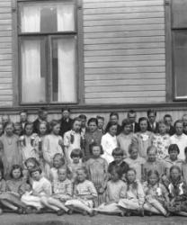 Koululaisia kirkonkylän kansakoululla. vas. opettajat Aino Åkerman ja Juho Hakala