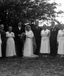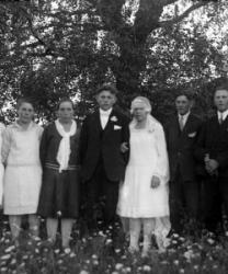 Morsiuspari Taito Rinne ja Hilma Mäenpää, vihitty 27.7.1929. Toinen vas. Elli Mäenpää-Putkiranta-Kaukovuo. Neljäs vas. Lyyli Mäenpää-Haapanen.