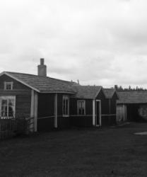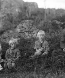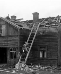 Talon korjaus. Ilomäen talon kattoa korjataan. Katolla vas. Matti Ilomäki ja vieressä tuntematon työmies. Tikapuilla istuu Hilda Ilomäki sylissään Vilho Ilomäki, alempana Sanni Ilomäki os. Ala-Salmi. Tikapuiden vieressä Vilhelmiina Ilomäki os. Housu