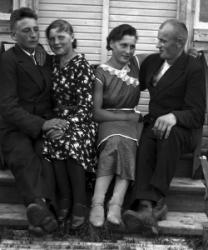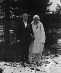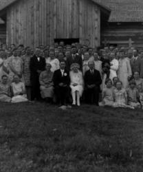 Lauri Virtasen ja Hilda Isomäen häät 17.5.1929. Morsiamen oikealla puolella Oskari ja Sanna Virtanen. Sulhasen vasemmalla puolella morsiamen vanhemmat Isomäet.