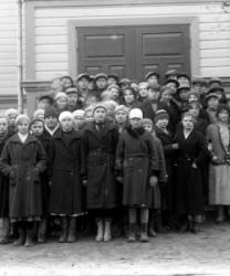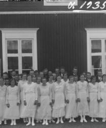 Oik. Kirkkoherra Väinö Tuomola, kuvassa tunnistettu mm. Kerttu Raiski myöh. Mursula, 1935 vuoden rippikoulaiset