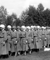 Töysän lottia. Edessä vas. Hilma Pohjola, Hilda Penttilä, Hilma Riihimäki, Hilma Paavola, 2. oik. Helmi Kanerva, 2. riviä keskellä 5. oik. Maija Hakomäki, 6. Hilma Koskenaho, 7. Anni Herrala, 1. oik. Saima Aho, takana vas. Maija Vuorenmaa