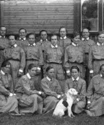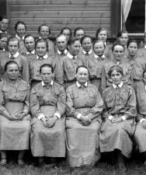 Eturivi 5. vas. Hilma Koskenaho, 1. oik. Gertti Manner, takarivi 1. oik. Hilma Paavola, 3.Saima Aho, 6. Liisa Herrala, 7. Fanni Paavola, 8. Elli Paavola, 10. Hilda Penttilä, 11. Hilma Riihimäki, ikkunasta katsoo Anni Herrala