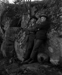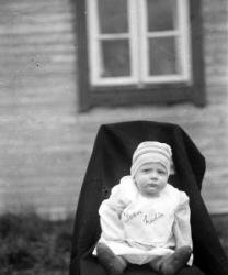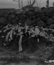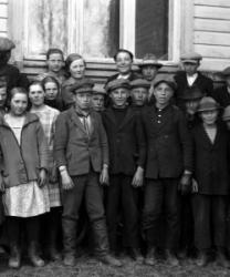 Rippikoululaisia 1911-1912 syntyneitä kirkon nurkalla. Kuvassa mm. seitsemäs oik. Onni Mäkiranta synt. 1911, toinen vas. Vieno Hauta-aho synt. 1912.