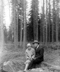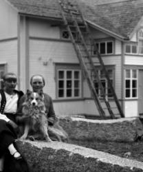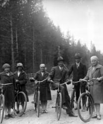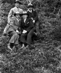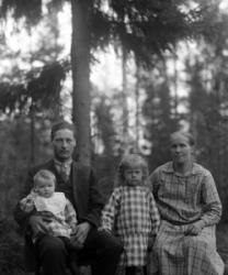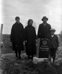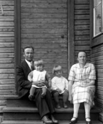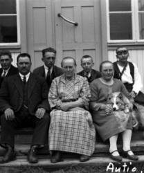 Vas. Kustaa Laurila, keskellä Maria Autio (os. Rankila), koira sylissään Marian tytär Impi (Kustaan vaimo), takana Hilma Pennala? (Hirvelä) ja miehensä Toivo Hirvelä? (Hirvimäki) sekä heidän poikansa Ossi?.
