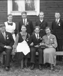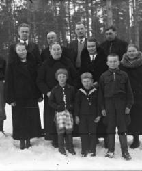 Takana Juho "Jussi" Kortesmäki, 3. oik Tyyne Kortesmäki (ent.Tuominiemi), edessä vaaleatukkainen Pauli, vanhin poika. Vas puolella Pentti, Korteniemet Matti, Kauppila Ellen, Isoisä Matti Kortesmäki, Toivo Kaunismaa, Palvelija?, Tyynen sylissä Raili, Elli Kauppila