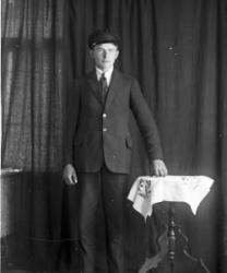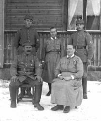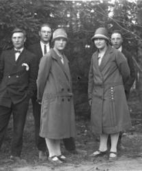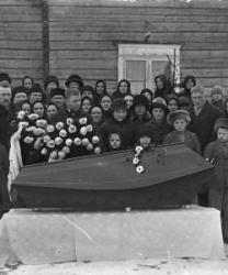 Maria Saaren (Riihimäki) hautajaiset s.1866 k.1921. Kukkien takana poika Matti Saari (kanttori). Arkun takana Hilda ja Elli Saari. oik. Hilma os. Virtala ja Juho Riihimäki, Hilman vierellä Eino ja Kalle Riihimäki.
