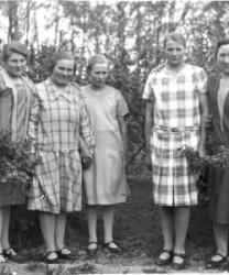Vas. Elli Hakala myöh. Hämäläinen, Maria Pitkäaho, Hilda Kivistö, Hilma Kitusenmäki, Iida Isoaho. Oms. Ylä-Vannesluoma.