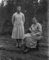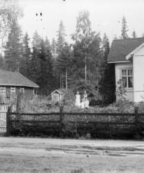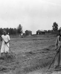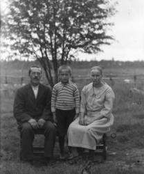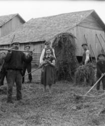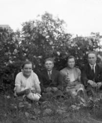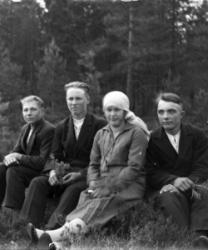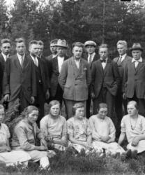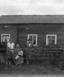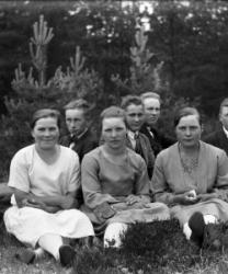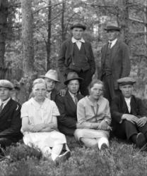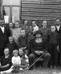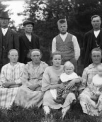 Ensimmäinen rivi alhaalta: Impi Luoma, Aila Luoma, Impi Luoma. Toinen rivi Eino Hietakangas, Onni Luoma, Valee Luoma, Vilho Luoma. Kolmas rivi: Mikko ja Hilda Hietakangas, Sanna Luoma, Helmi ja Viljo Luoma. Takana vas. Veikko Luoma, Toivo Hietakangas, Martta Hietakangas, Aili Luoma. Nämä asuivat Alavudella.