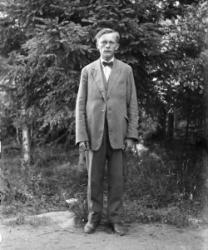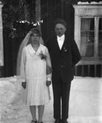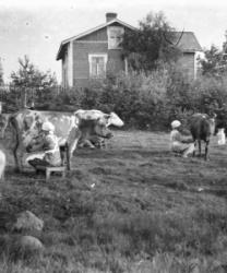 Iida ja Vihtori Paavolan lehmät Vähtärin mäen alla. Vasemmalla sankarihauta, hautausmaa, kirkko. Kuvassa oleva rakennus on Töysän ensimmäinen kunnantalo.