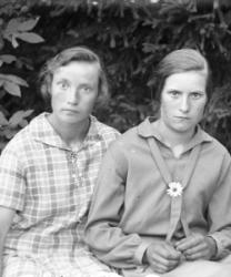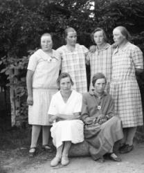 Edessä vas. Alli Paavola (tark. karjakko), Lempi, Aili ja Fanni Paavola. Takana vas. Hilda Aittoniemi, Maiju Vuorenmaa, Elli Paavola, Saima Aho (tark. karjakko).