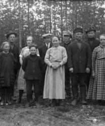 Olga ja Heikki Jokela sekä perhe. Edessä vas. Paavo, Olga, Kerttu ja Alpo Jokela. Vas takana. Eino Myllyaho, Tauno Jokela, Artturi Jokela, Heikki Jokela ja Arvo Jokela. Takana vahtitupa Töysästä Ähtäriin päin.