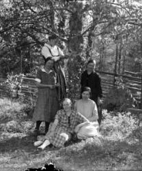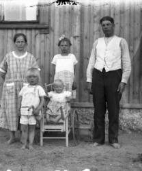 Liina, Wilhelmiina (Mimma), Katri, Aukusti, Vilho, Aili Katajamäki, takana Haapa-Aho. Kuva lähetetty perheen isälle Aleksi Katajamäelle Amerikkaan.