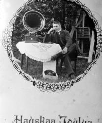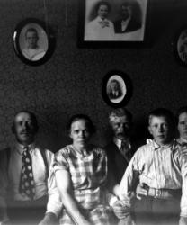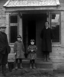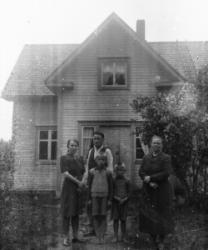 Prinkkilän talo, oik. Katajamäki Hilda (vanha emäntä), takana vas. Lilja, Johan ja pojat Unto ja Olavi