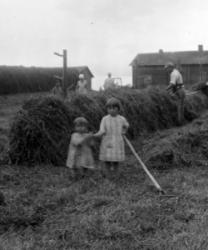 Lamminahon heinäpellolla, edessä Irma, Mirjam Lamminaho, Haasion vieressä Juha, Eino Lamminaho. Lamminahon talo. Hakojärvi